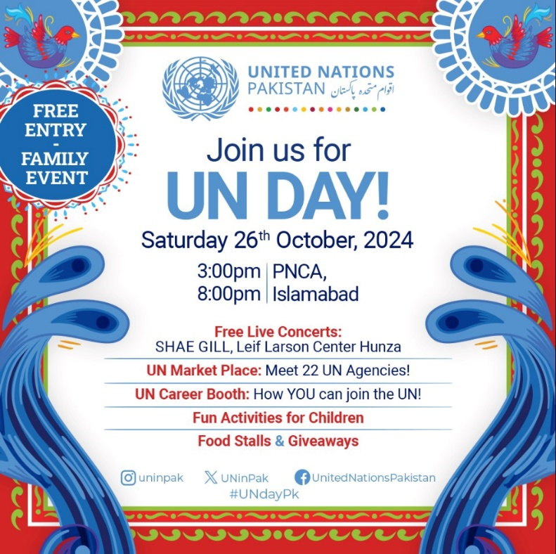 This Saturday, the United Nations in Pakistan is inviting the public to join a family-oriented event that will celebrate “UN Day” at the Pakistan National Council of the Arts (PNCA) in Islamabad on Saturday 26th afternoon.