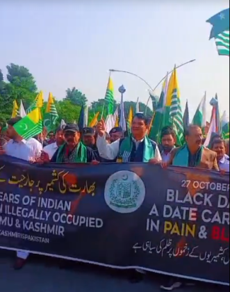 ISLAMABAD, Oct 27 (APP):In solidarity with the people of Indian Illegally Occupied Jammu and Kashmir (IIOJK), a rally marking Kashmir Black Day was taken out from the Ministry of Foreign Affairs and culminated at D-Chowk, resonating with passionate slogans and chants for Kashmiri freedom and justice.