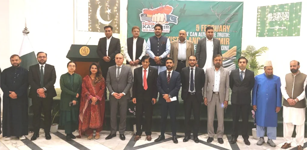 On the occasion of Kashmir Solidarity Day (February 5), a dignified ceremony was held at the Embassy of Pakistan in Riyadh, which was attended in large numbers by members of the Pakistani and Kashmiri communities, along with diplomatic officials. The participants reaffirmed their firm resolve to stand shoulder to shoulder with their Kashmiri brothers and sisters until the freedom of Indian Illegally Occupied Jammu and Kashmir is achieved. Addressing the gathering, speakers strongly condemned the grave and continuous human rights violations being committed by Indian forces in occupied Kashmir, where innocent Kashmiris are being subjected to brutal oppression.
